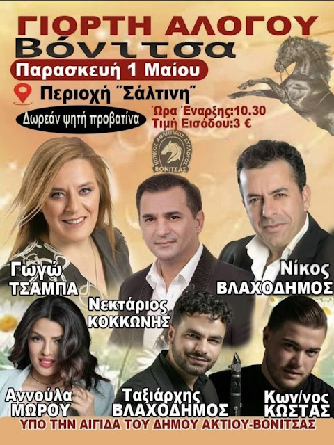 Την Παρασκευή 1 Μαΐου, στην περιοχή «Σάλτινη», θα πραγματοποιηθεί η καθιερωμένη Γιορτή Αλόγου από τον Ιππικό Αθλητικό Σύλλογο Βόνιτσας.