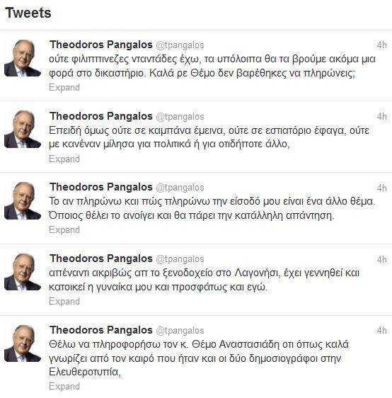 Με τον δικό του απολαυστικό τρόπο απαντά μέσω του Twitter στο Πρώτο Θέμα ο Θεόδωρος Πάγκαλος καθώς για ακόμα μια φορά βρέθηκε στο στόχαστρο συκοφαντικών δημοσιευμάτων της εφημερίδας.