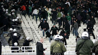 Με τη λήξη του πρώτου ημιχρόνου, ομάδες ατόμων εξήλθαν από κερκίδες του σταδίου, επιτέθηκαν με σφοδρότητα κατά των αστυνομικών δυνάμεων με ρίψη φωτοβολίδων και άλλων αντικειμένων. Οι επιθέσεις συνεχίστηκαν και με ρίψη βομβών μολότοφ.
