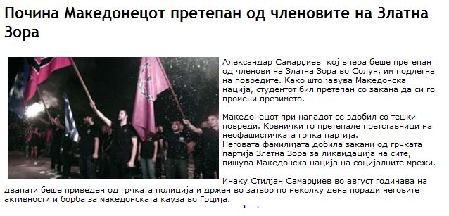 Τα ΜΜΕ στη γειτονική χώρα αναφέρουν ότι ένας Σκοπιανός με όνομα Αλεξάντερ Σαμαερτζίεφ υπέκυψε στα τραύματα του στη Θεσσαλονίκη. Οπως επισημαίνεται στα δημοσιεύματα το συγκεκριμένο άτομο ξυλοκοπήθηκε άγρια από μέλη της Χρυσής Αυγής με την απειλή να αλλάξει το επώνυμό του!