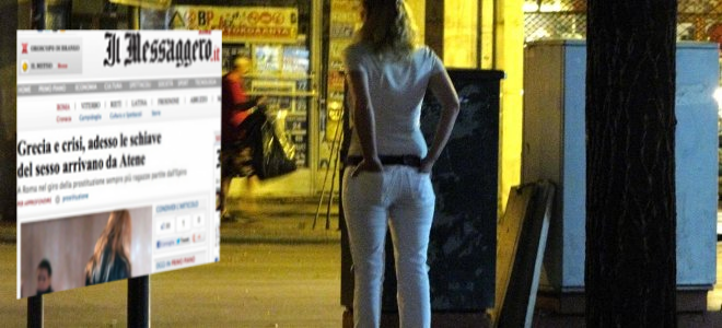 Ολοένα περισσότερες Ελληνίδες λόγω οικονομικής κρίσης ταξιδεύουν ως την Ιταλία για να γίνουν πόρνες υποστηρίζει σε δημοσίευμα της η ιταλική εφημερίδα «Il Messaggero». Ο συντάκτης του άρθρου αναφέρει πως άνδρες της ιταλικής.... αστυνομίας εντόπισαν νεαρές Ελληνίδες να κάνουν πεζοδρόμιο στη Ρώμη.
