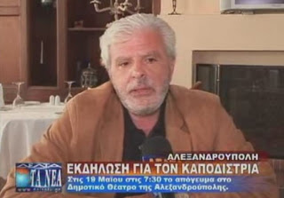 Ρεπορτάζ το Σάββατο 18 Μαΐου 2013, του τοπικού καναλιού Delta Tv της Αλεξανδρούπολης για την εκδήλωση που διοργανώνει η Ιερά Μητρόπολη Αλεξανδρούπολης και ο Δήμος της πόλης , στα πλαίσια των "Ελευθερίων 2013". Η εκδήλωση με θέμα ΙΩΑΝΝΗΣ ΚΑΠΟΔΙΣΤΡΙΑΣ-Ο ΑΓΙΟΣ ΤΗΣ ΠΟΛΙΤΙΚΗΣ θα πραγματοποιηθεί την Κυριακή 19 Μαΐου 2013 και ώρα 7.30μμ στο Δημοτικό Θέατρο Αλεξανδρούπολης με ομιλητή τον συγγραφέα κ.Ιωάννη Κορνιλάκη. Στο βίντεο ο κ.Κορνιλάκης απευθύνει ανοιχτή πρόσκληση στο λαό της Αλεξανδρούπολης για την ξεχωριστή εκδήλωση στην οποία θα μπορέσει ο καθένας να γνωρίσει τον πρώτο Κυβερνήτη της ανεξάρτητης Ελλάδας, μέσα από τις αποκαλυπτικές επιστολές του Ιωάννη Καποδίστρια και οι οποίες εμπεριέχονται 137 από αυτές στο πόνημα του συγγραφέα.