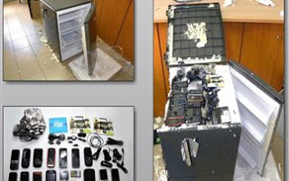 Κατά τον έλεγχο που διενήργησαν σωφρονιστικοί υπάλληλοι στο ψυγείο, βρέθηκαν επιμελώς κρυμμένα στην οροφή του και κατασχέθηκαν 15 κινητά τηλέφωνα, 11καλώδια φορτιστών, 4 αντάπτορες φόρτισης, 3 κάρτες SIM και 2 μπαταρίες κινητών τηλεφώνων. Επιπλέον, κατασχέθηκε το συγκεκριμένο ψυγείο.