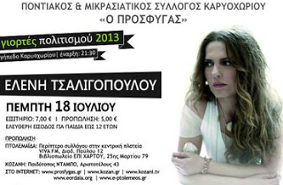 Πέμπτη 18 Ιουλίου 2013 Συναυλία με την Ελένη Τσαλιγοπούλου, σε παραδοσιακά και γνωστά λαϊκά τραγούδια, σε alternative και jazz δρόμους παρέα με τους πάντα άψογους μουσικούς που την συνοδεύουν:
