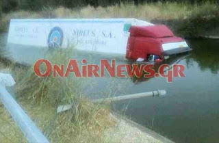Χθες το απόγευμα στην διώρυγα κοντά στο χωριό του Αη Ηλία έπεσε νταλίκα. Ο οδηγός κατάφερε άμεσα και βγήκε μέσα απο το όχημα και δεν κινδύνεψε.