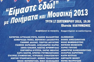 Για δεύτερη χρονιά η ιστορική πλατεία Κλαυθμώνος, στην καρδιά της Αθήνας, θα πλημμυρίσει ποιήματα και μουσική, την Τρίτη 17 Σεπτεμβρίου στις 19.30, με τη συμμετοχή σημαντικών ποιητών και καλλιτεχνών.