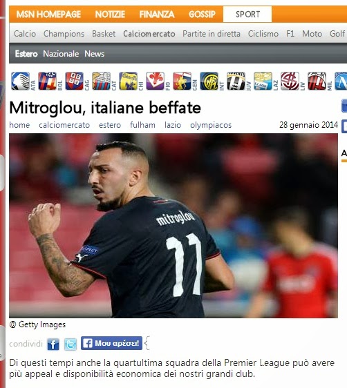 Θέμα στην Ιταλία έχει γίνει η πιθανή μεταγραφή του Κώστα Μήτρογλου στην Φούλαμ και δημοσιεύονται επικριτικά σχόλια σε βάρος των ομάδων του Καμπιονάτο που δεν μπορούν να ανταγωνιστούν μικρομεσαίες αγγλικές ομάδες!