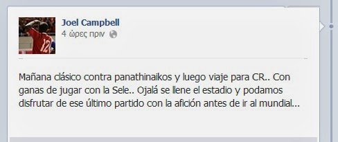 Ο Κάμπελ έγραψε στο Facebook του: «Αύριο έχουμε clásico με τον Παναθηναϊκό και μετά ταξιδεύω στην Κόστα Ρίκα. Ελπίζω το γήπεδο να είναι γεμάτο και να μπορέσω να απολαύσω το τελευταίο μου παιχνίδι πριν πάω να παίξω με την Εθνική ομάδα. Ανυπομονώ και για το ματς με την Κόστα Ρίκα».