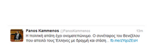 Επίθεση εναντίον του Αντωνη Σαμαρά εξαπέλυσε σήμερα ο πρόεδρος των Ανεξάρτητων Ελλήνων, κ. Πάνος Καμμένος μέσω του Twitter, λίγο μετά την παρουσίαση του οικονομικού προγράμματος της ΝΔ στο Ζάππειο.
