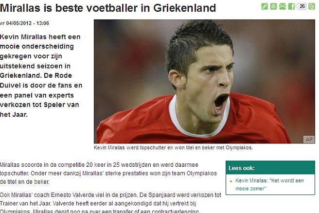 Συγκεκριμένα, γίνεται λόγος για τα 20 τέρματα που σημείωσε ο Μιραλάς και που οδήγησαν τον Ολυμπιακό στην κατάκτηση του 39ου πρωταθλήματός του, ενώ παράλληλα γίνεται αναφορά και στην ανάδειξη του Ερνέστο Βαλβέρδε ως τεχνικού της χρονιάς για την Ελλάδα. Όπως γίνεται αντιληπτό, ο Μιραλάς, που έχει επιστρέψει στα προσκλητήρια της Εθνικής Βελγίου, είναι για τα καλά στο… μικροσκόπιο του Τύπου της πατρίδας του, καθώς θεωρείται πλέον ως μία από τις σημαντικότερες… ελπίδες για το μέλλον του ποδοσφαίρου της χώρας.