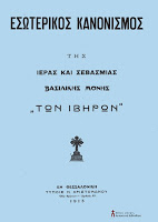 Εσωτερικός Κανονισμός της ιεράς και σεβασμίας βασιλικής μονής «των Ιβήρων». Θεσσαλονίκη 1915